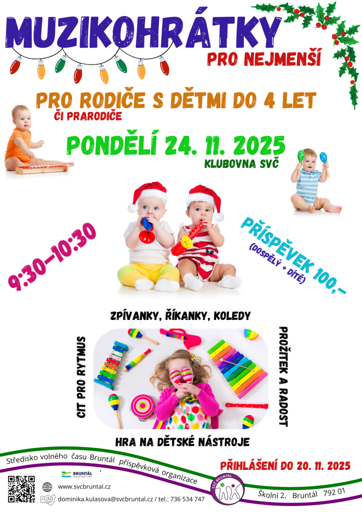 Zveme všechny rodiče či prarodiče s dětmi do 4 let na předvánoční hudební dopoledne. Děti si vyzkouší tvořit rytmus, budou tancovat, tleskat a hrát na dětské nástroje, poznají nové zvuky, procvičí koordinaci pohybů, motoriku, práci s rodičem a kamarády a také rozvinou cit pro rytmus. Zazpíváme si i nějaké koledy a dáme si i něco dobrého na zub.