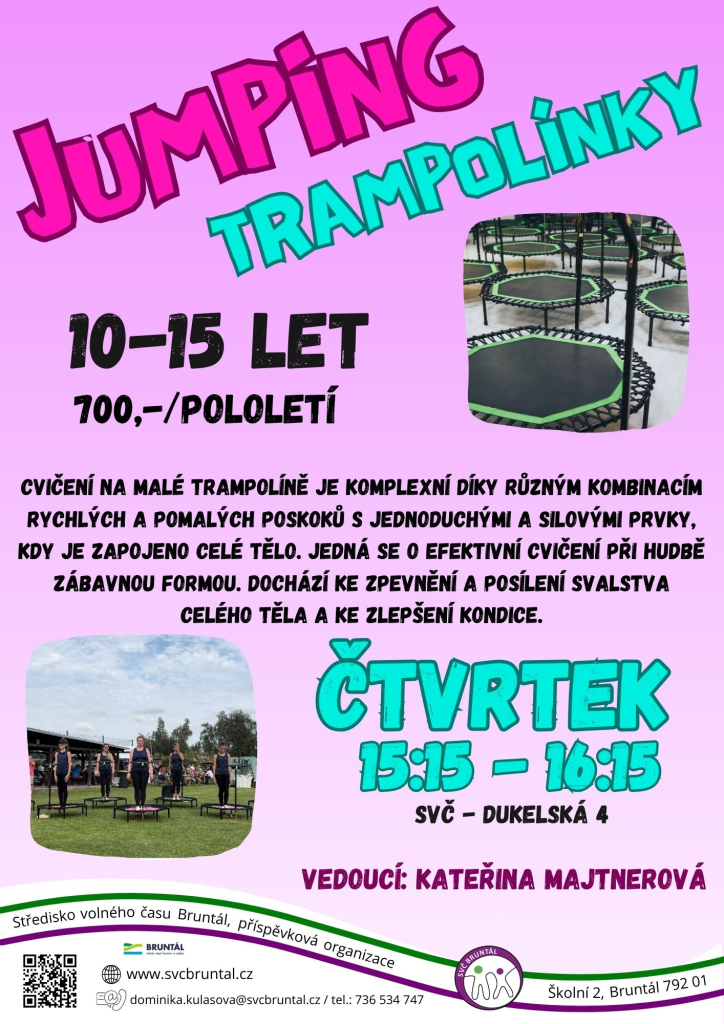 Jumping je sport naprosto pro všechny, na své si přijde opravdu každý. Cvičení probíhá na malých trampolínách – k dispozici má na cvičení každý jednu.