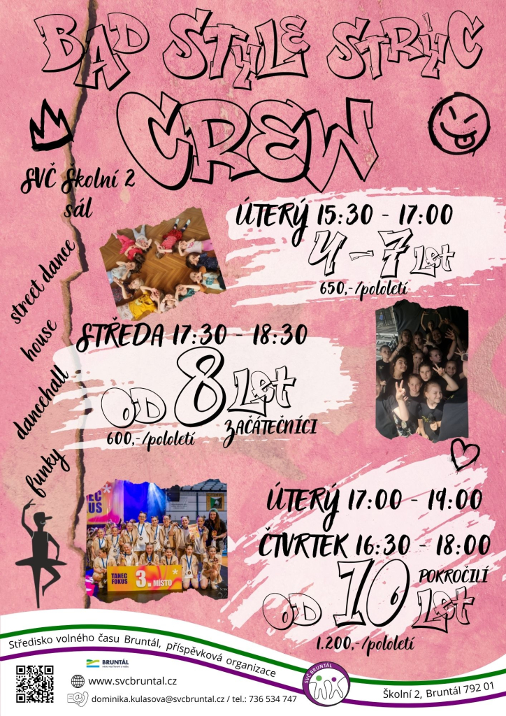 Taneční pohybová průprava pro naše nejmenší. Děti se na trénincích protáhnou, naučí se nové taneční kroky z hip hopu, funku, housu. Zahrají si různé taneční hry. Najdou si nové kamarády a budou mít zábavu ve volném čase. Během školního roku děti čeká vystoupení na různých akcích ve městě Bruntál.