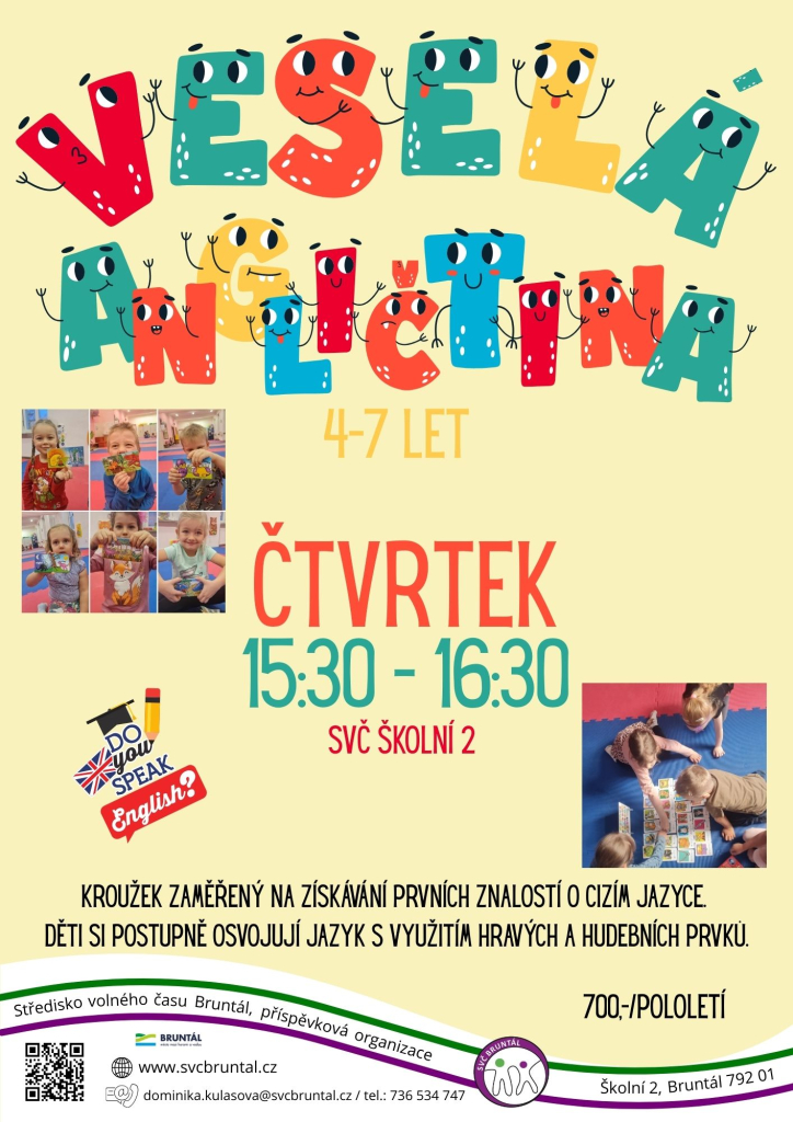 Kroužek zaměřený na získávání prvních znalostí o cizím jazyce. Děti si postupně osvojují jazyk s využitím hravých a hudebních prvků. Naučí se barvy, roční období, rodinné příslušníky, zájmena, zvířátka, části těla. Budou si mezi sebou povídat, zpívat si a také zkoušet mluvit ve větách.
