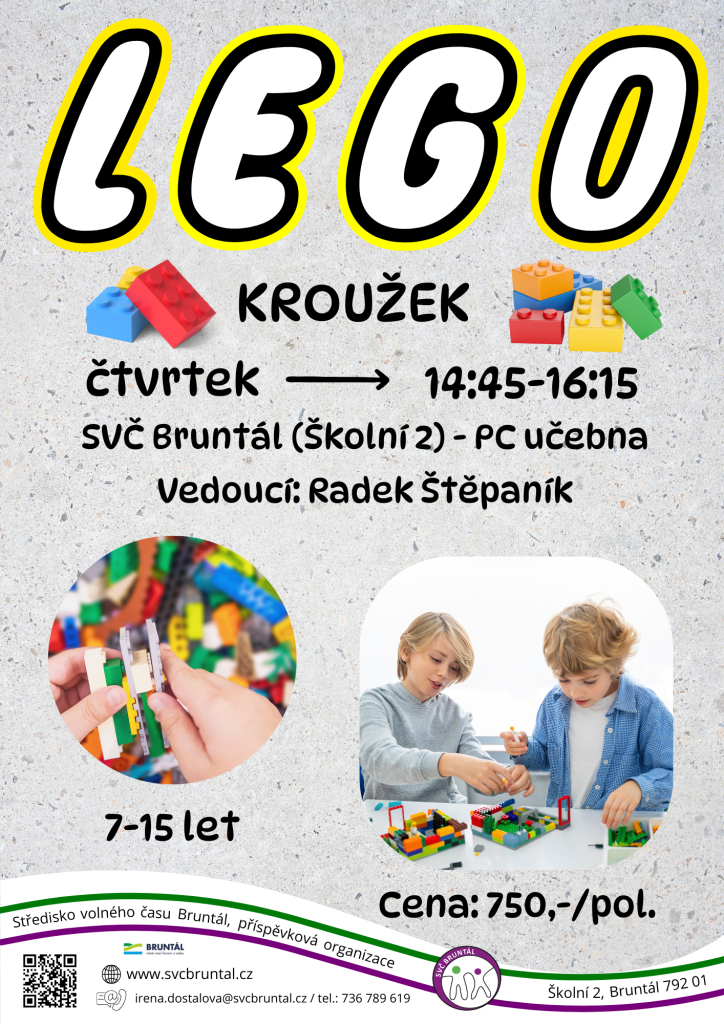 Máš chuť stavět, ale nemáte doma dostatek lego kostek? Chceš se podílet na společných projektech? Kroužek je určen pro všechny nadšence do stavění z LEGO stavebnic. Stavění z Lego stavebnic podporuje jemnou motoriku, fantazii, ale i komunikační dovednosti.
