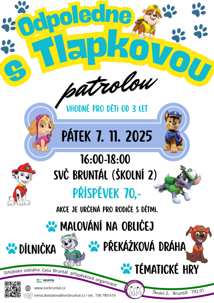 Zveme Vás na odpoledne s Tlapkovou patrolou, které proběhne v pátek 7. 11. 2025. Můžete se těšit na dílničku, překážkovou dráhu, malování na obličej a různá stanoviště. Akce je vhodná pro rodiny s dětmi od 3 let.